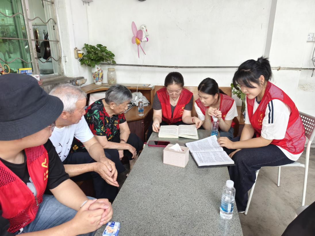 温情互动,代际共融暖人心。活动穿插生活知识竞答、红歌合唱、广场舞教学等环节,《红日》和《最炫民族风》的旋律拉近了两代人的距离。学生志愿者还分组入户探访高龄老人、老党员和困难家庭,聆听人生故事,记录生活需求。一位九旬老太握着志愿者的手回顾往昔,滔滔不绝。其女儿开心地告诉志愿者:“你们的到来,足够我妈回味两三个月,甚至半年……”
