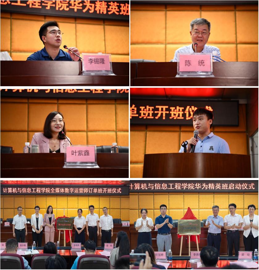 随后,会议举行了华为精英班启动仪式和全媒体数字运营师订单班开班仪式。华为广东政企韶关总经理李锡隆、轩辕网络董事长陈统、澳源副总经理叶紫鑫、订单班学员代表曾维豪作发言,对外合作中心主任王修琼、教务部部长吴洲与企业代表共同为华为精英班、全媒体数字运营师订单班揭牌。