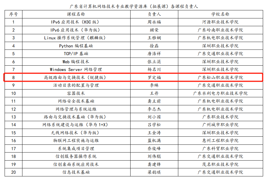 近日,教育厅公布了《广东省教育厅关于公布2021年省高等职业教育教学质量与教学改革工程项目立项名单的通知》(粤教职函〔2022〕23 号)。由深圳职业技术学院牵头申报的“计算机网络技术专业教学资源库”成功立项,我校计算机与信息工程学院计算机网络技术专业课程《高级路由与交换技术》(负责人:罗定福)成功入选此次教学资源库建设。