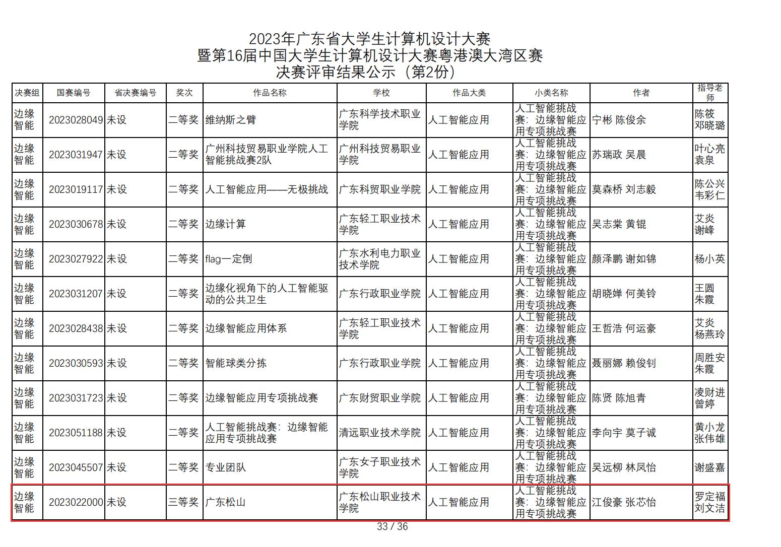 6月30至7月1日,由广东省教育厅主办的2023年广东省大学生计算机设计大赛暨第16届中国大学生计算机设计大赛粤港澳大湾区赛决赛人工智能应用边缘智能应用专项挑战赛在广州科技贸易职业学院举行。我校由计算机与信息工程学院张芯怡(21级信息安全技术应用班)、江俊豪(22级信息安全技术应用班)两名学生组成的代表队,经过激烈角逐,成功斩获人工智能应用-边缘智能应用专项挑战赛全国三等奖的好成绩。